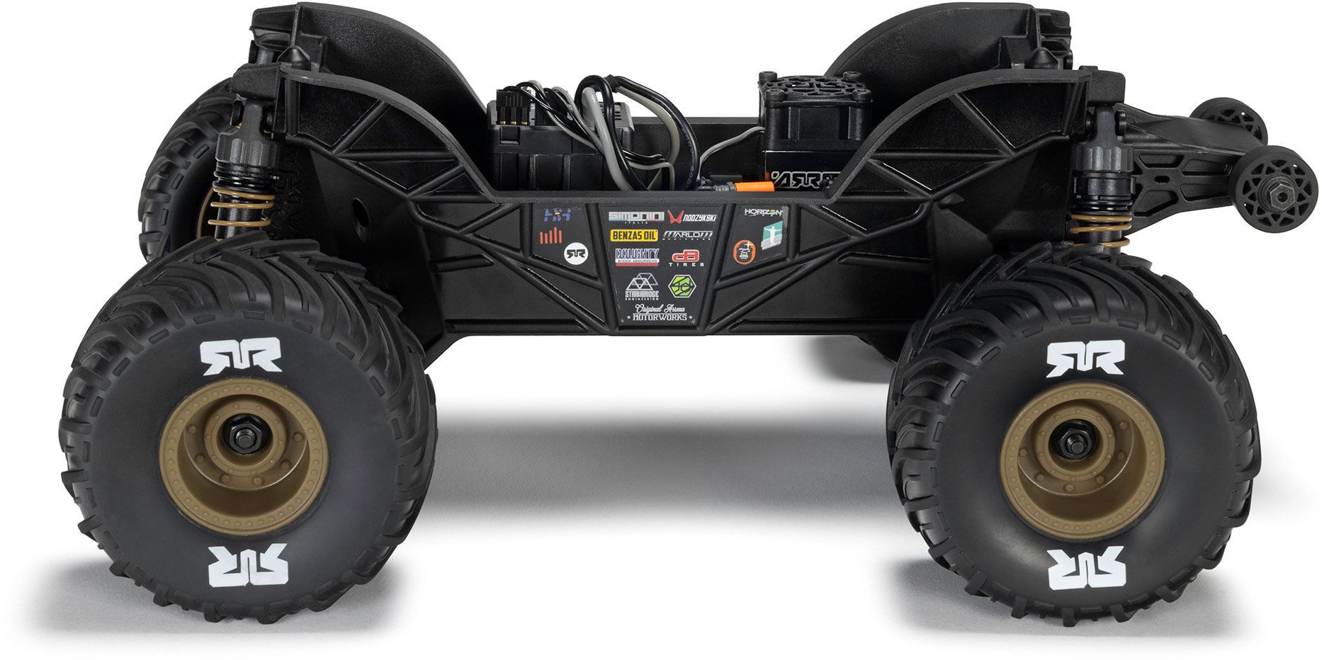 Underneath, the reinforced chassis and high-travel suspension is built to withstand every petrifying impact and keep going. This truck isn't just tough. It's smart. The deep tub chassis keeps out dirt and debris so you can bash harder without clogging the works. The monster truck stance and elevated center of gravity allow it to conquer all obstacles in its way. Chaos, indoors or out, is where the GORGON GROM rules.