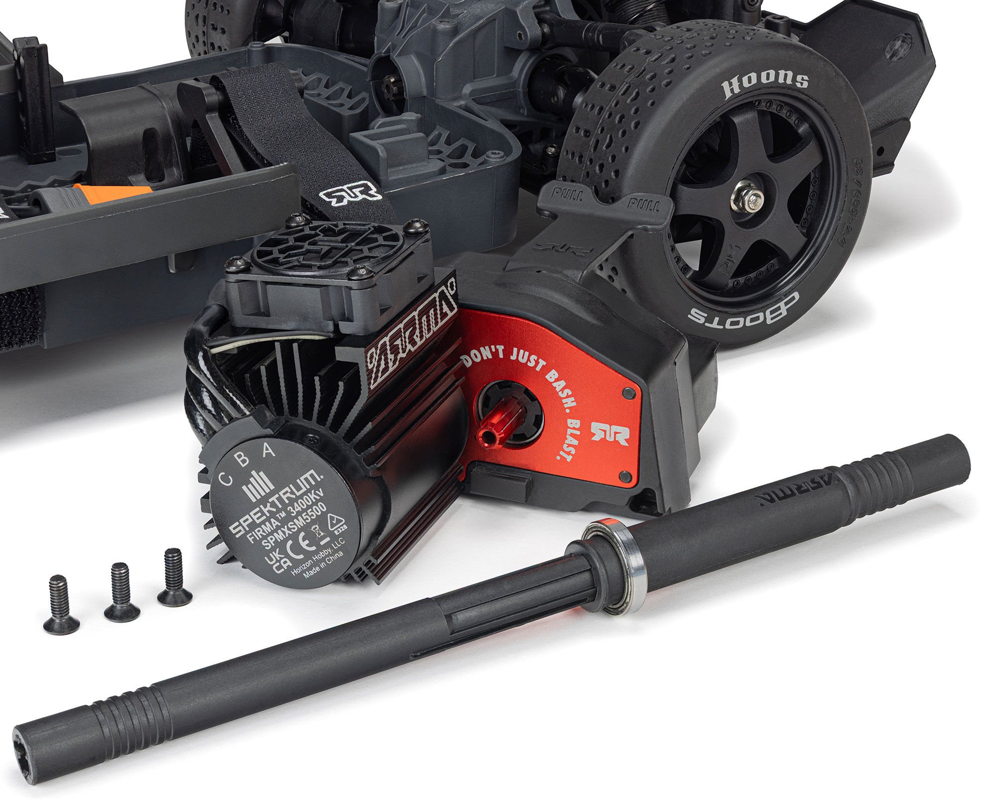 High performance dBoots Hoons belted tires are standard, delivering the all-road grip you need for tarmac, gravel, and everything in between. The iconic Infraction body, available in Blue/Red, Red/Black, and Teal/Pink, turns heads before you've even hit the throttle. Waterproof Spektrum electronics keep the fun rolling through puddles and mud and provide clean, responsive control and easy serviceability. The Spektrum SLT3™ transmitter adds helpful control as you level up. Add your 2S or 3S LiPo and discover how much ground a 65+ MPH street machine can cover.