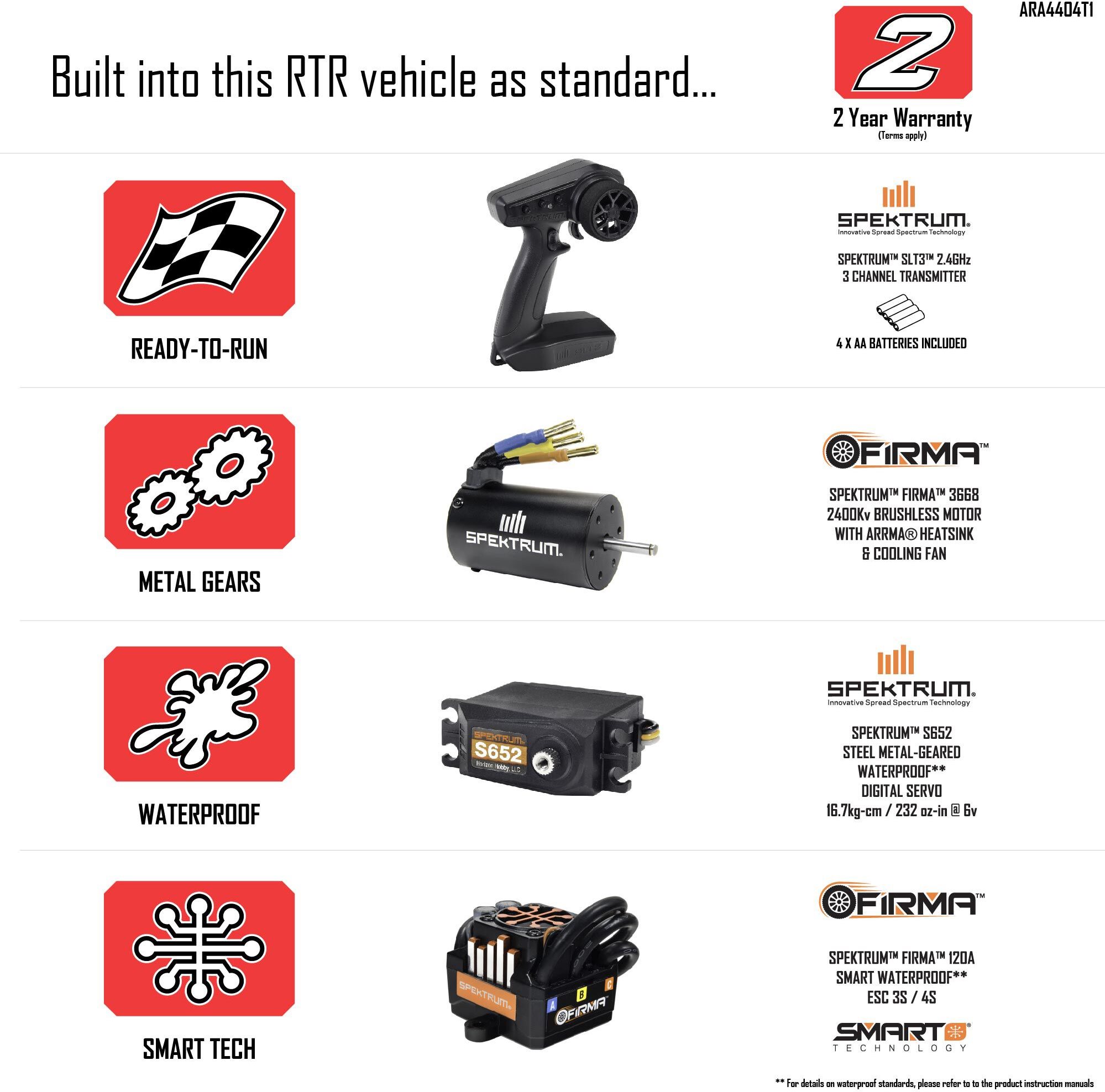 Cut loose with incredible acceleration courtesy of the factory-installed Spektrum Firma™ 2400Kv brushless motor and waterproof Firma 120A ESC with IC5® connectors. The heavy-duty composite chassis and EXB (EXtreme Bash)-enhanced transmission take it all in stride. The MOJAVE Desert Truck also introduces a rugged center diff to the ARRMA 4S BLX 4X4 platform, for truly awesome traction and handling.
