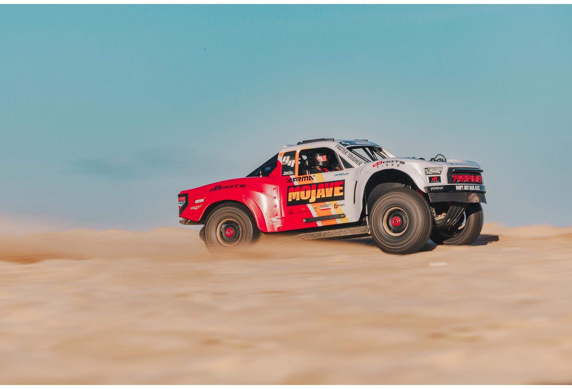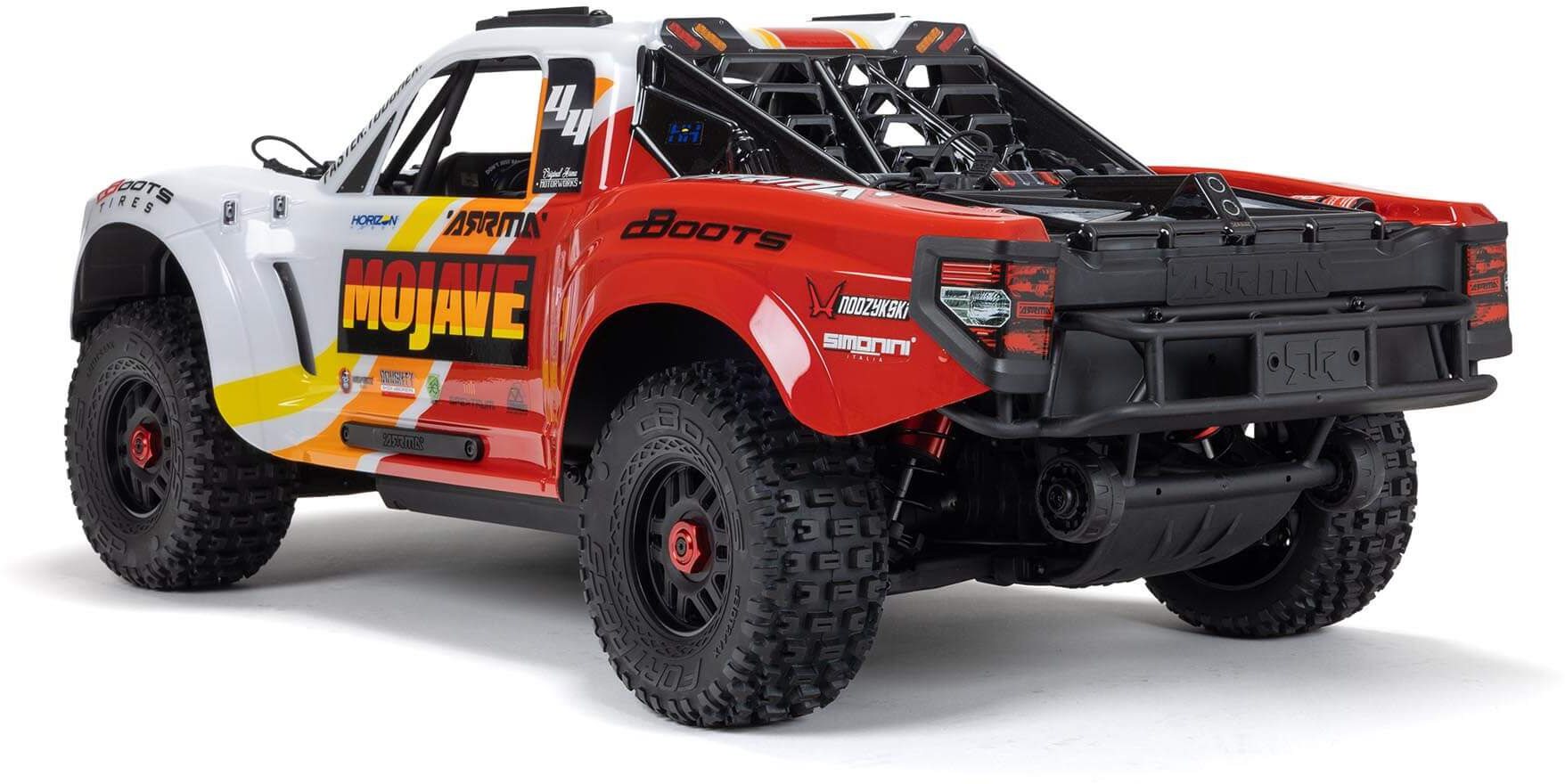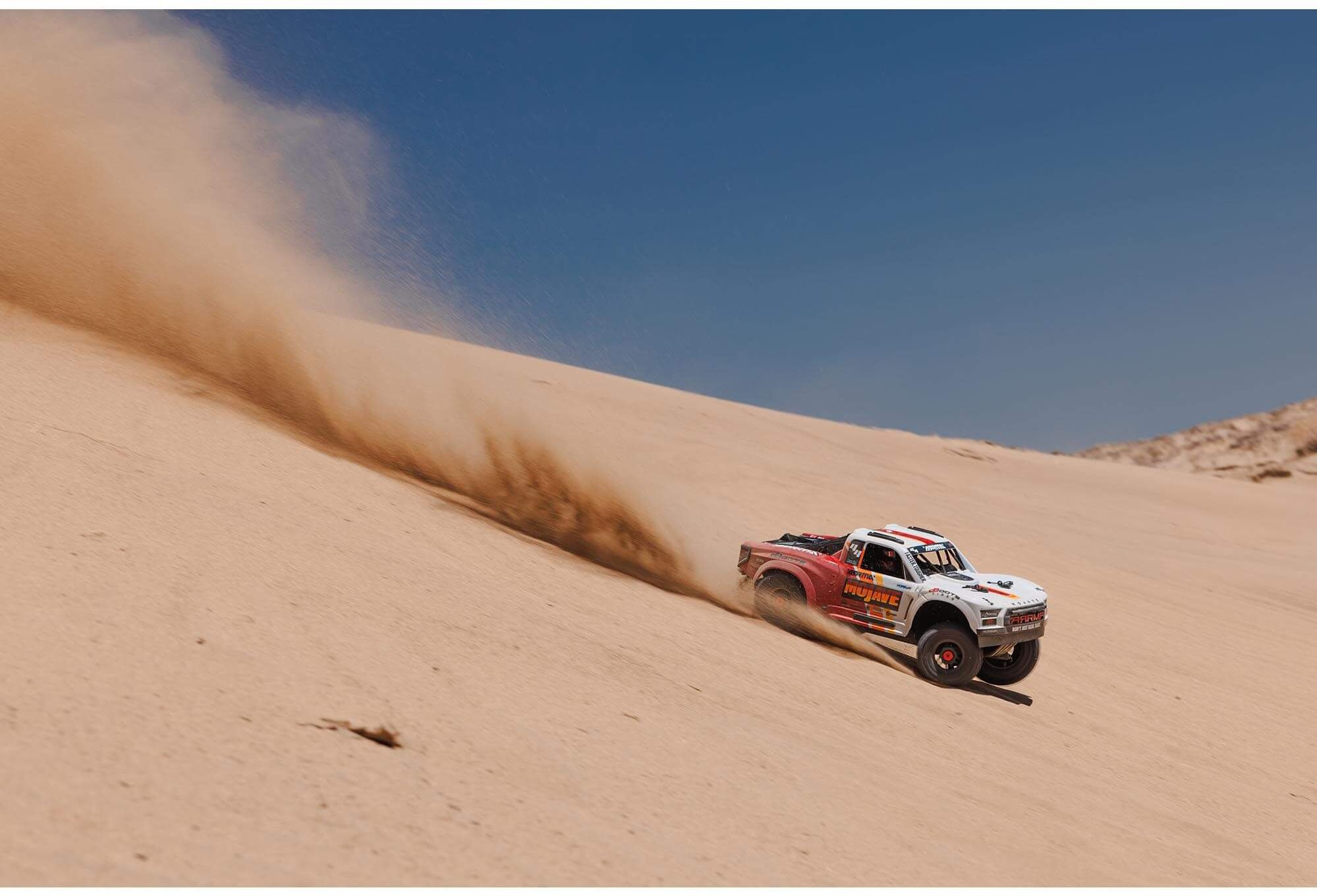 Go brushless bashing in a big way with the affordable ARRMA® MOJAVE™ 4S BLX 4X4 Desert Truck RTR. It's got it all — legendary toughness, dynamic handling, and the brutal speed of a Spektrum™ 4S-ready brushless power system that's capable of 50+ mph under optimum conditions. Even better, this high-performance package comes wrapped in exciting 1/8 scale desert truck realism, complete with a detailed cockpit plus a roll cage and roof rails!