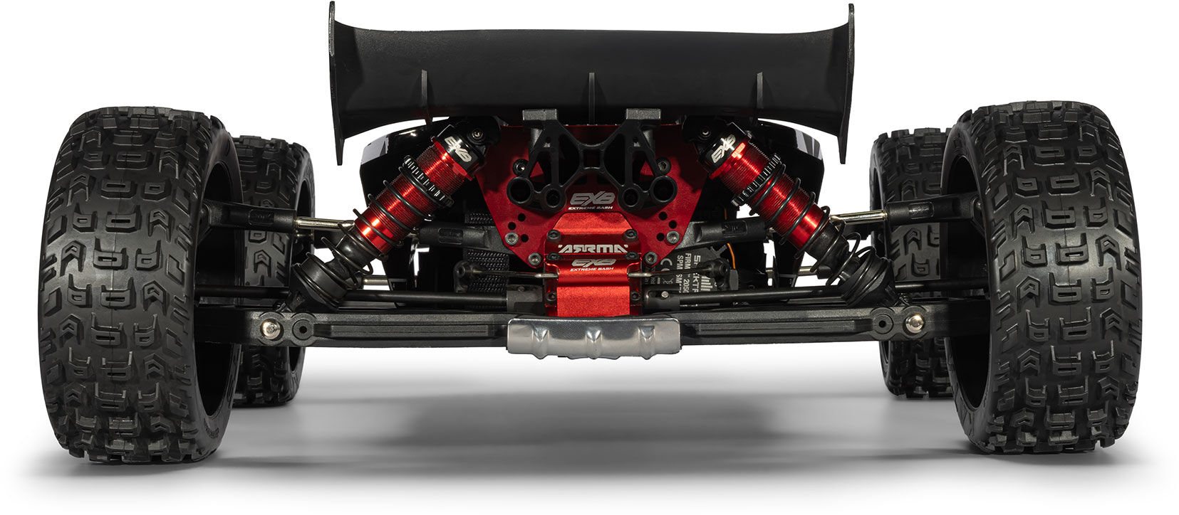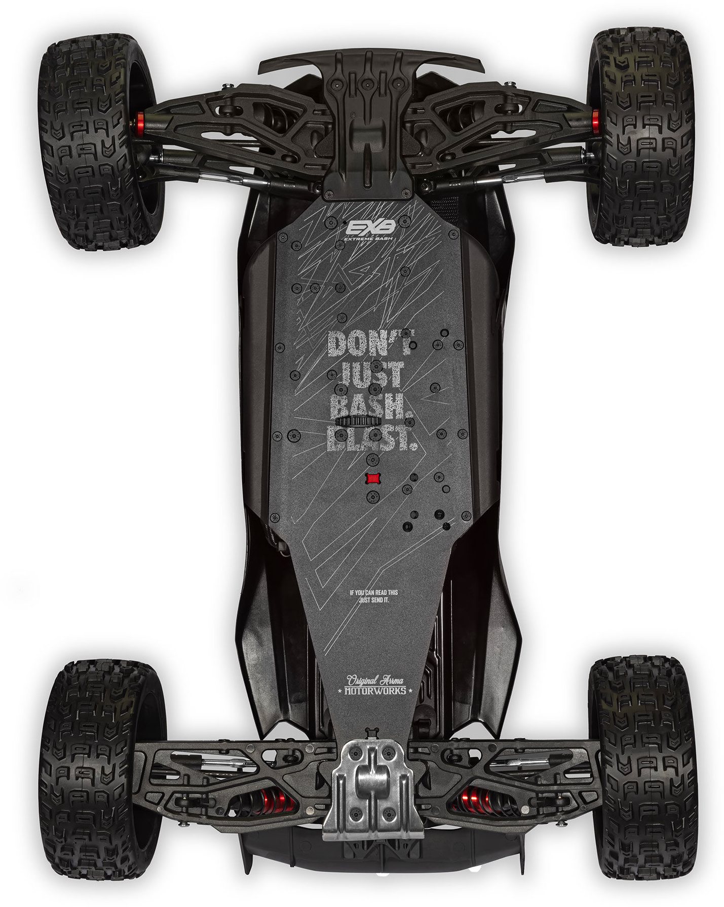 The 1/7 TALION 6S EXB RTR was built to handle it all with a laser-etched 7075 T6 aluminum chassis plate, anodized aluminum bulkheads, and heavy-duty composite side guards that can take serious punishment. Stronger diff outdrives front and rear, all-metal gearbox internals, and durable steel driveshafts throughout make the drivetrain as tough as the conditions you'll run it in. Split tower-to-tower center braces, EXB shock towers, and a high-downforce, one-piece wing mount add rigidity and improve handling at speed.