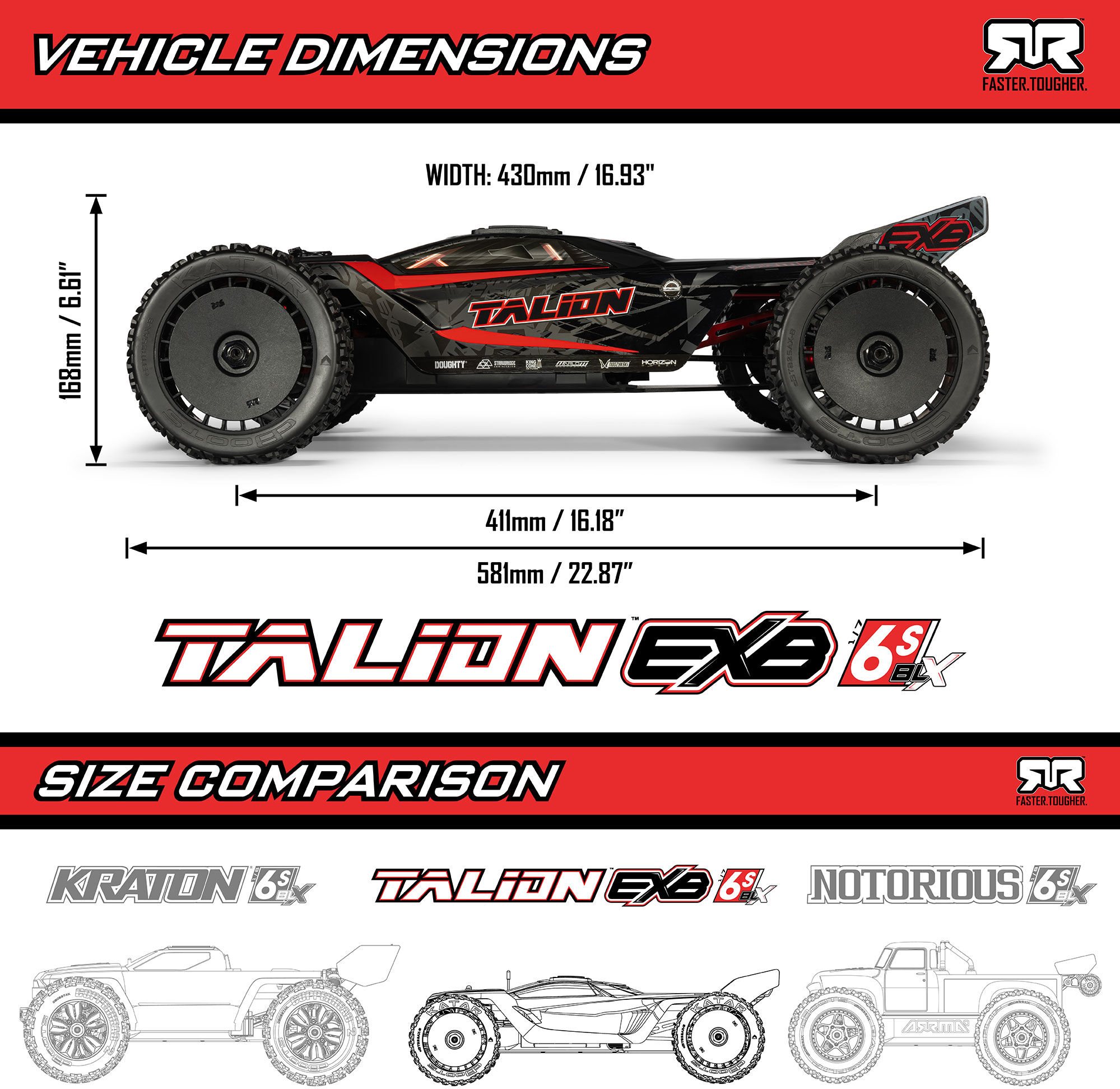 The new TALION 6S EXB RTR comes with everything you need to get on the road. Just add a battery and charger. This is the TALION you remember, rebuilt for today. Longer. Faster. Stronger. And ready to dominate.