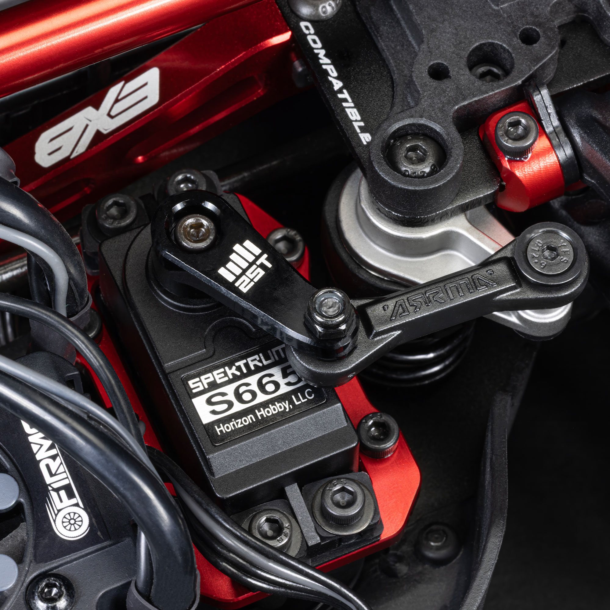 Powering it all is the Spektrum Firma 4074 2050Kv Brushless Motor, matched to a Firma 150A Smart V2 ESC running the same upgraded B5.12 firmware found on the KRATON and NOTORIOUS V6. The result is sharper acceleration, smoother power delivery, and smarter throttle control. Split tower-to-tower center braces, EXB shock towers, and a high-downforce one-piece wing mount lock everything in tight, so you stay planted, precise, and in control when the speed climbs and the extreme chaos kicks in. The high-torque Spektrum S665 waterproof digital servo handles steering with precision, and the Spektrum SLT3 transmitter and SR315 receiver round out an electronics package built for performance and reliability in any conditions.