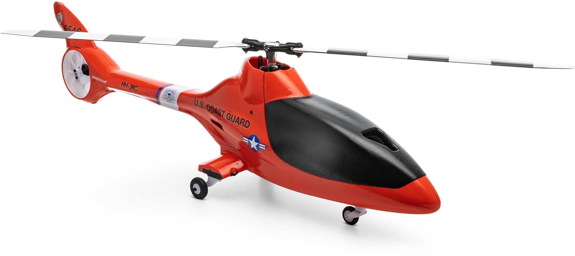 An innovative blend of scale-like looks including a fully molded and painted EPO body wrapped around a high-performance pod-and-boom airframe makes the Blade® Eclipse 360 Coast Guard an eye-catching addition to any RC pilot’s collection. It’s designed to be capable of smooth hovering plus scale-like and sport flying for intermediate pilots, yet is also capable of aerobatics and even mild 3D in the hands of experienced pilots. The expertly-tuned FC6250HX flybarless control system includes optional-use SAFE technology for angle limits and automatic self-leveling to help prevent crashes in Normal mode, and no limits in all other flight modes – plus Panic Recovery to “bail out” at the push of a button if you ever need it! The brushless direct-drive ducted fan tail motor and elongated aluminum tail boom keep the heli firmly locked in, and the brushless outrunner main motor provides excellent power and throttle response for an impressive control feel. Both motors are connected to a Spektrum Dual Smart ESC that delivers real-time telemetry data to AirWare™ equipped transmitters, and they’re compatible with common and popular 3S 2200–3200mAh batteries. Digital, metal-geared servos, an aluminum head block, and carbon fiber main rotor blades with stripes deliver reliable and precise control for the factory-assembled airframe. The lightweight yet durable body is equipped with LED navigation and landing lights along with hard mounting points for the low-profile skids that provide a streamlined “gear up” look, or you can install the included wheel set for a different look and ground handling experience. And it’s all delivered in a model ready to bind to your favorite Spektrum transmitter to offer a unique helicopter flying experience you can’t get anywhere else!