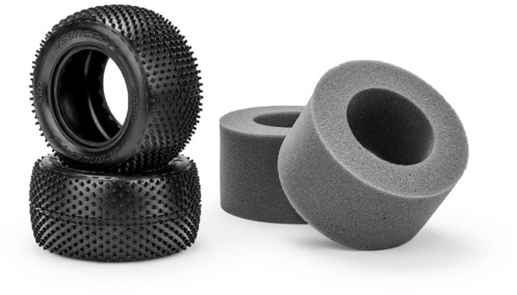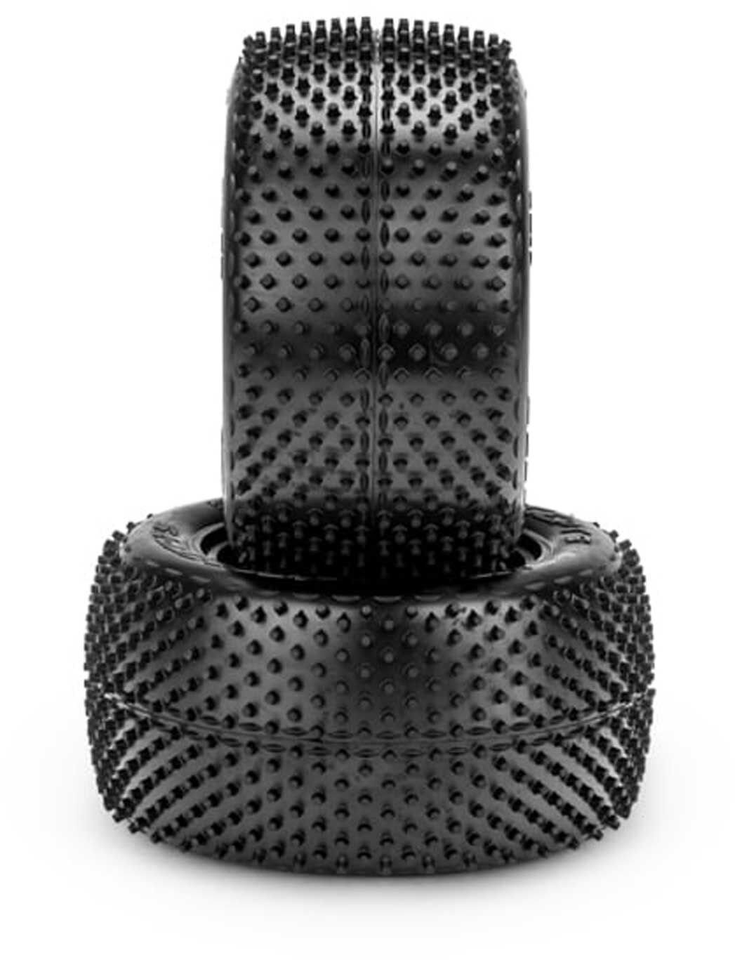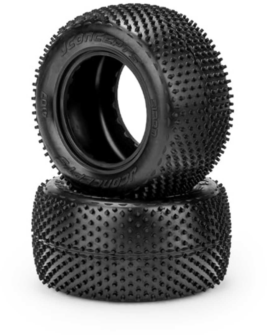 Designed in the industry standard 2.2” bead mounting size, the Siren is very versatile and has shown to work in many natural and artificial conditions. The semi-circle protrusions, unique to the Lockness, Nessi, and now the Siren are included in the center section of the tire and on the sidewall area. These details are important, and the low semi-circles improves side-bite but also minimize grip-rolling instances associated with normal pins. The pink compound represents a new compound for JConcepts, a medium soft material with good wear characteristics. The rear tires include open cell inserts making them a complete set ready to mount, straight out of the package.