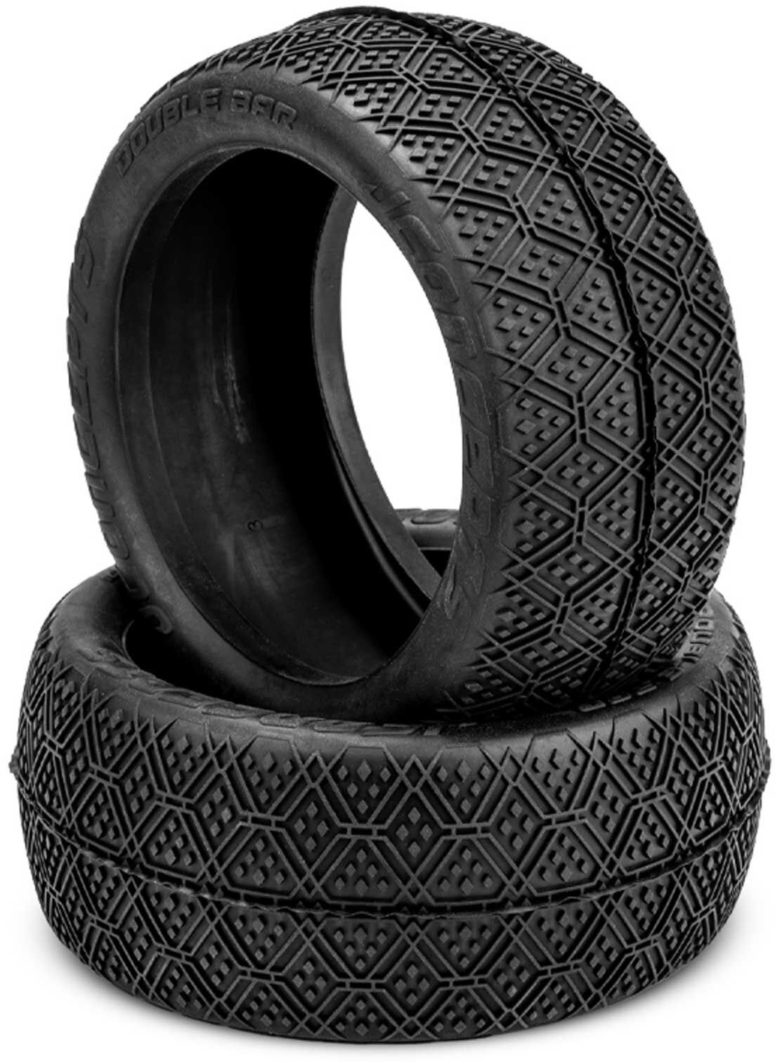 As the dual tread intersects itself, a wall provides additional side bite and stability during hard side-loads and 180-degree corners. The soft and layered tread terminates at the edge, and it rolls off to give the tire an easy transition for an easier driving feel. A continuous radius carcass is built into the Double Bar to take on more difficult jumping tasks, faster speed track layouts, and reduce the ballooning effect of racing at higher speeds.