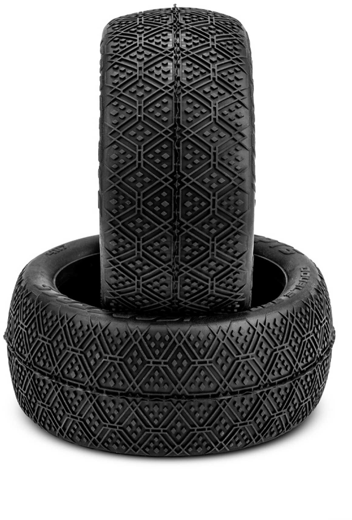 Using previously unseen elements with the dual nature of the tread, the JConcepts item is an entirely different monster. The overlapping and repeated concept, now available for 1:8th trucks, is one that intends to tackle conditioned track surfaces and heavy slick groove conditions like never before. Located in the infield of the tread, diamond patterned pins consume space, surface area, and ultimately a flexible arrangement that conforms to high-end racing conditions.