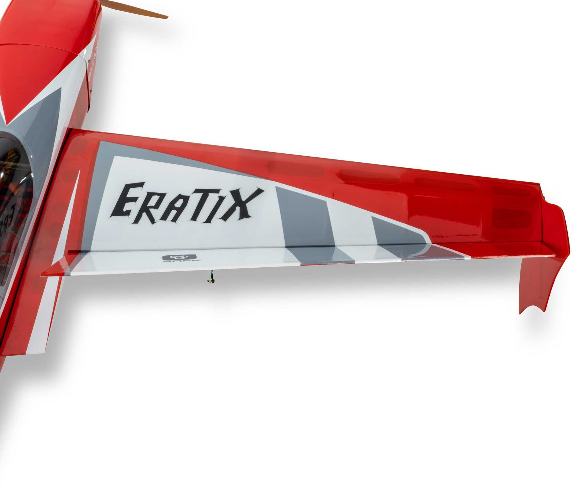 The E-flite® Eratix 3D Sport Wood Series (SWS) 1.6m (64”) offers the aggressive aerobatic plus smooth sport flying performance of similar models – without all the hassles of building one! The BNF Basic version assembles without glue and can be ready to fly in less time compared to the many hours it usually takes to construct other models in its class. It's based on the design of the “flat foamy” Eratix but features strong, stiff, and lightweight built-up wood construction. The balsa and plywood airframe with carbon fiber reinforcement throughout arrives factory-finished with genuine UltraCote™ film covering. The BNF Basic version arrives mostly factory-assembled, so you can have it flying in almost no time — without glue or special tools. A two-piece wing that installs without fasteners and tools makes it easier to store and transport. Plus, you can install the included and optional-use Side Force Generators (SFGs) for even better aerobatic capabilities.