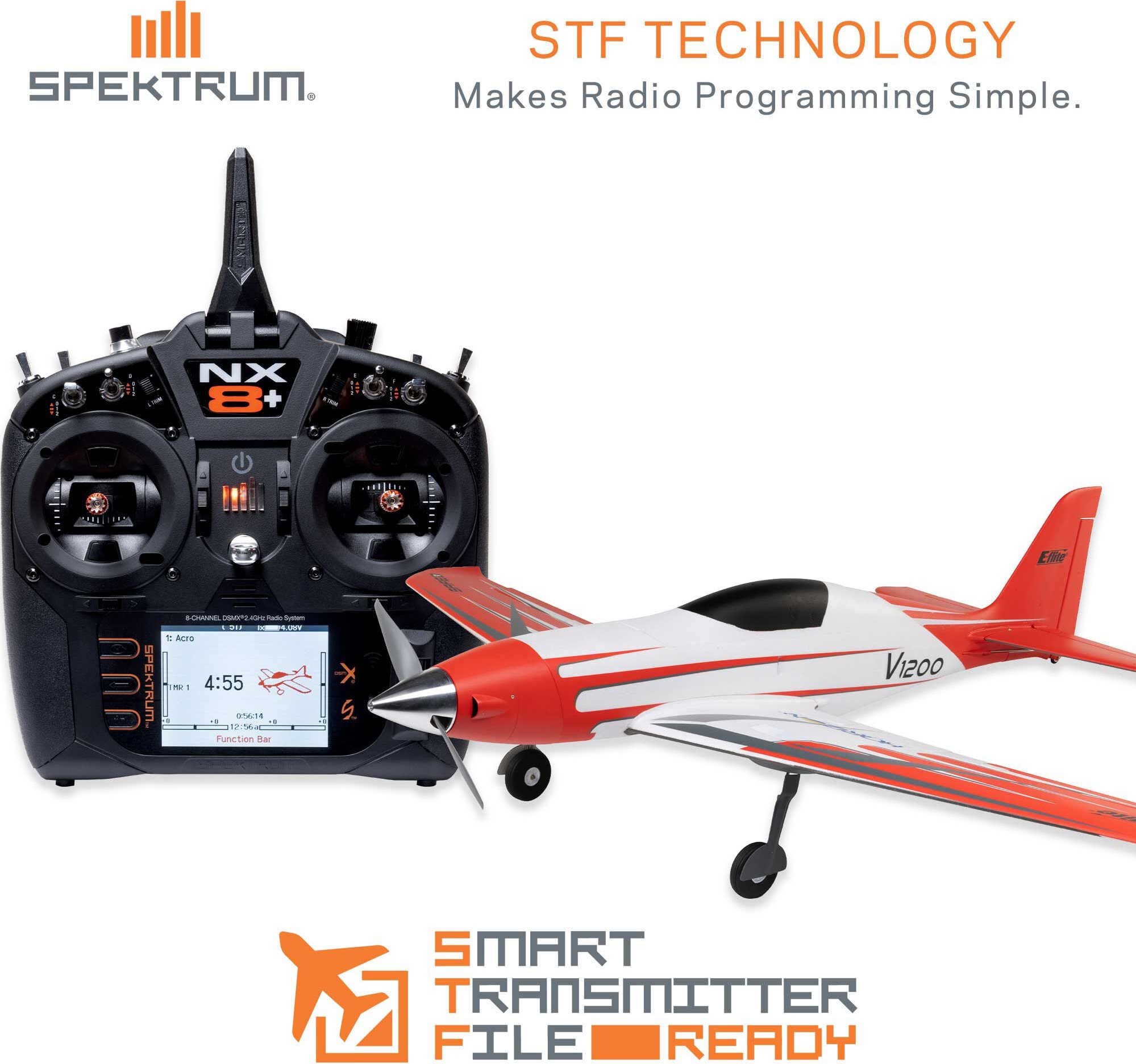 Grab the sticks to fly the fastest prop-driven E-flite airplane yet! With 4S 3200–5000mAh batteries and the factory-installed brushless power system, the V1200 reaches up to 110+ MPH in level flight- making it suitable for intermediate pilots with some high-speed flying experience. Or more experienced pilots can unleash level-flight top speeds up to 140+ MPH with popular 6S 3200–7000mAh batteries! The Spektrum Avian 100A Smart ESC lets you speed with confidence, knowing all is well with the power system and battery from the real-time telemetry data sent via compatible receivers (such as the BNF Basic version's AR637TA+) to Spektrum AirWare-equipped transmitters.