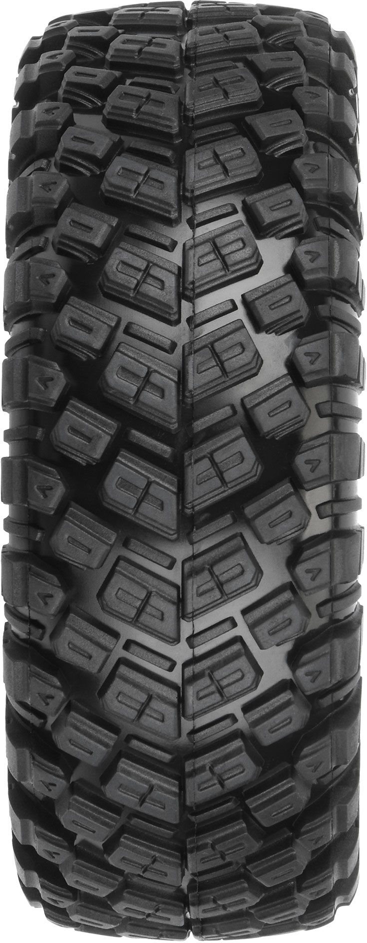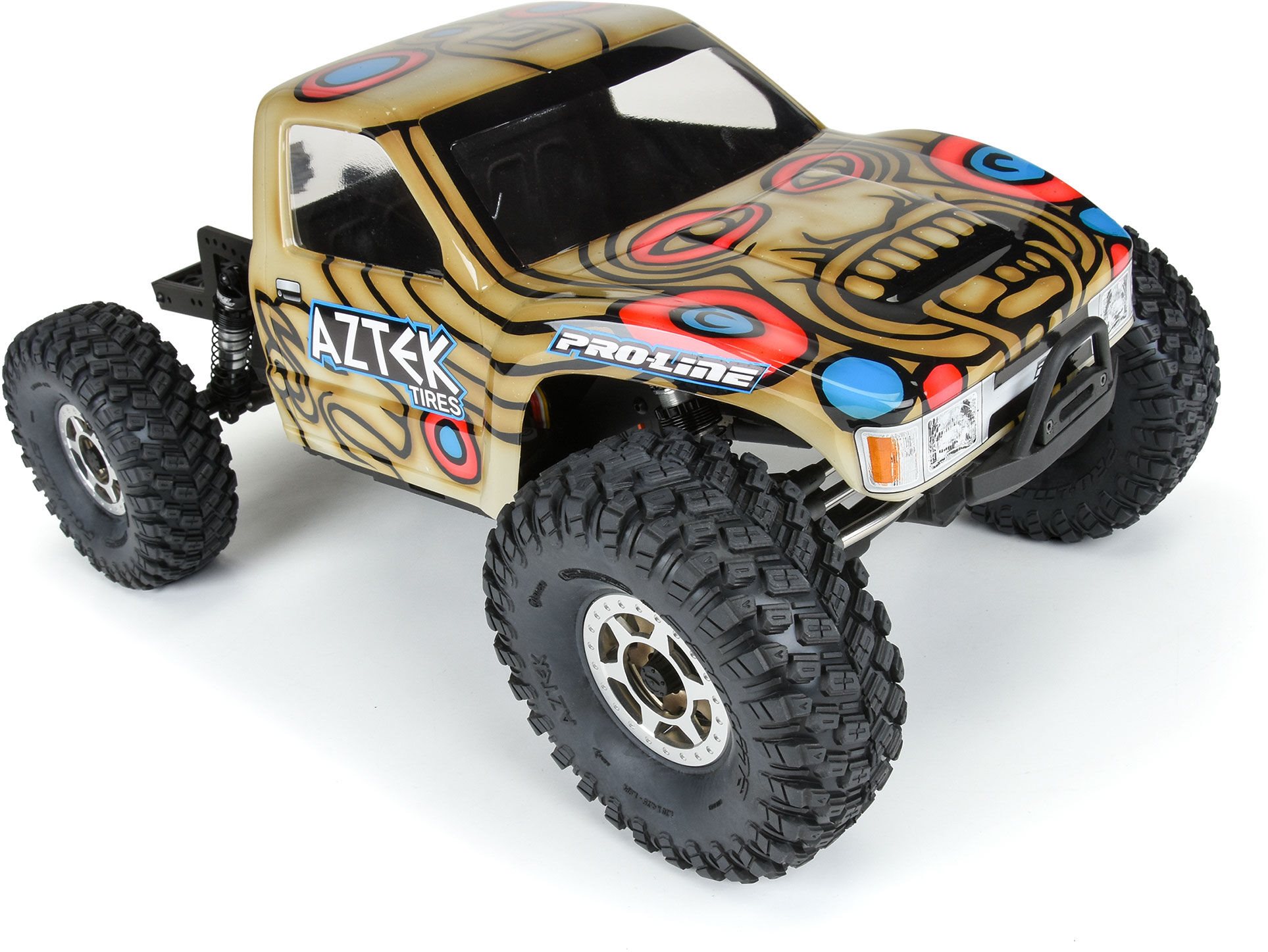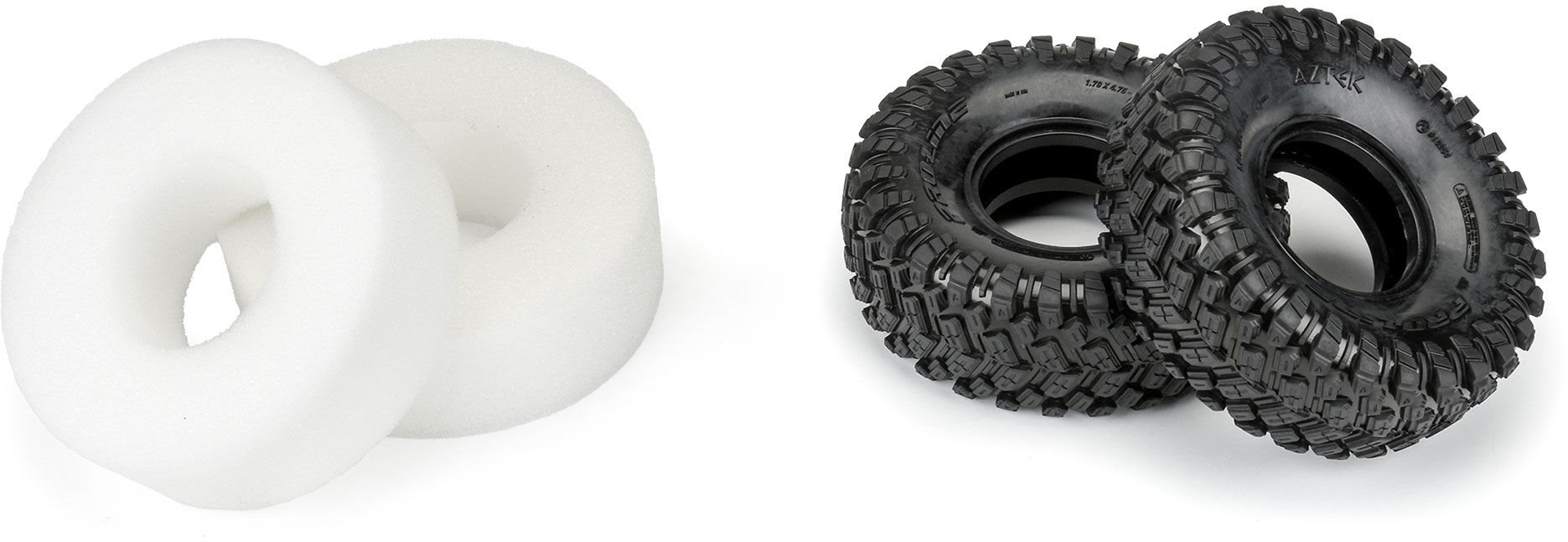 This is a pair of Aztek 1.9" Rock Crawling Tires. Pro-Line proudly announces the release of the Aztek, a revolutionary RC rock-crawling tire designed to redefine off-road performance standards. The Aztek boasts a chevron-shaped, stepped lug tread design, fortified by heavy-duty sidewall lugs with siping for enhanced side-hilling capabilities. This tire is meticulously crafted to conquer any terrain, offering exceptional forward bite in wet or dry, abrasive or slick conditions.