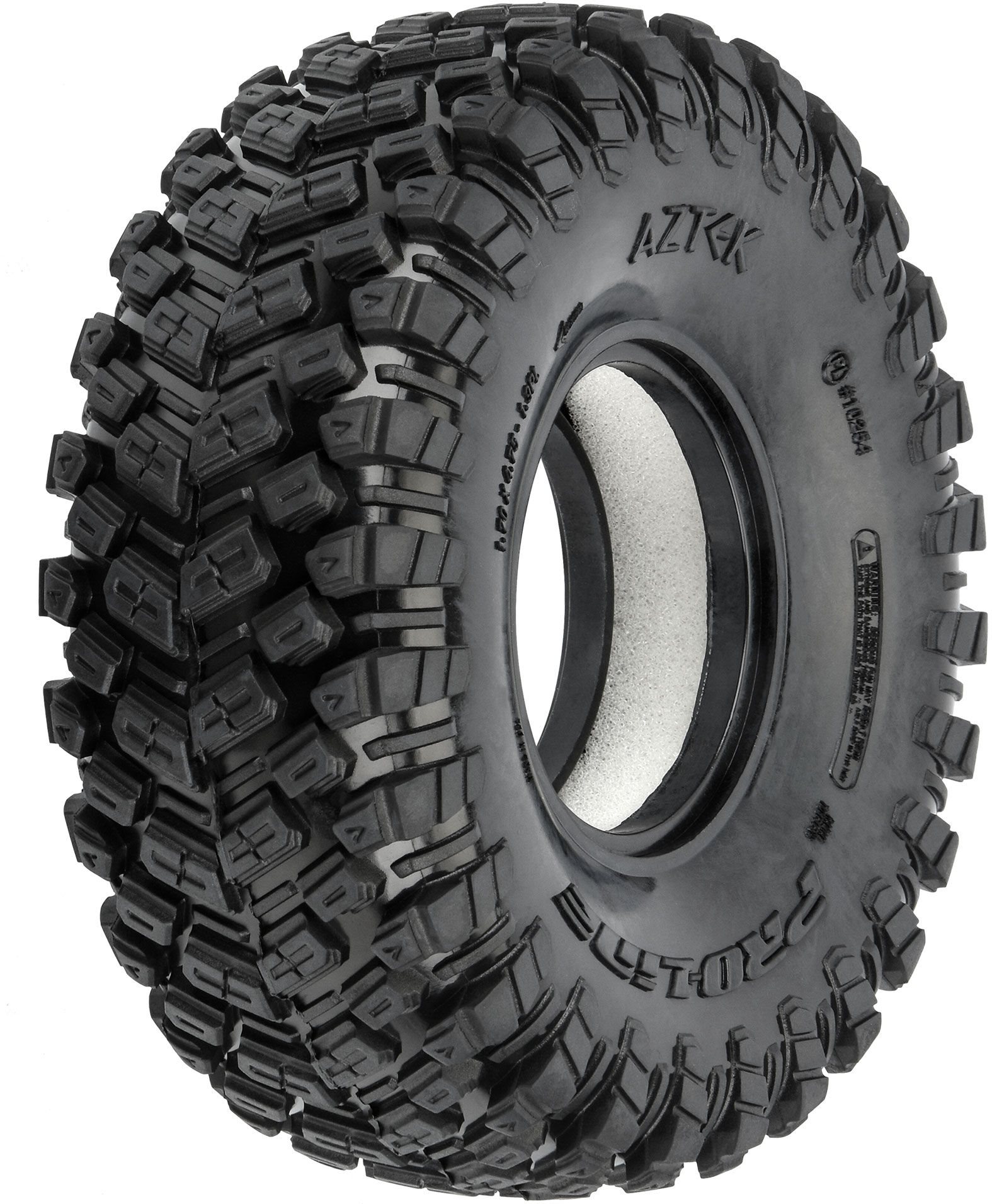 This is a pair of Aztek 1.9" Rock Crawling Tires. Pro-Line proudly announces the release of the Aztek, a revolutionary RC rock-crawling tire designed to redefine off-road performance standards. The Aztek boasts a chevron-shaped, stepped lug tread design, fortified by heavy-duty sidewall lugs with siping for enhanced side-hilling capabilities. This tire is meticulously crafted to conquer any terrain, offering exceptional forward bite in wet or dry, abrasive or slick conditions.