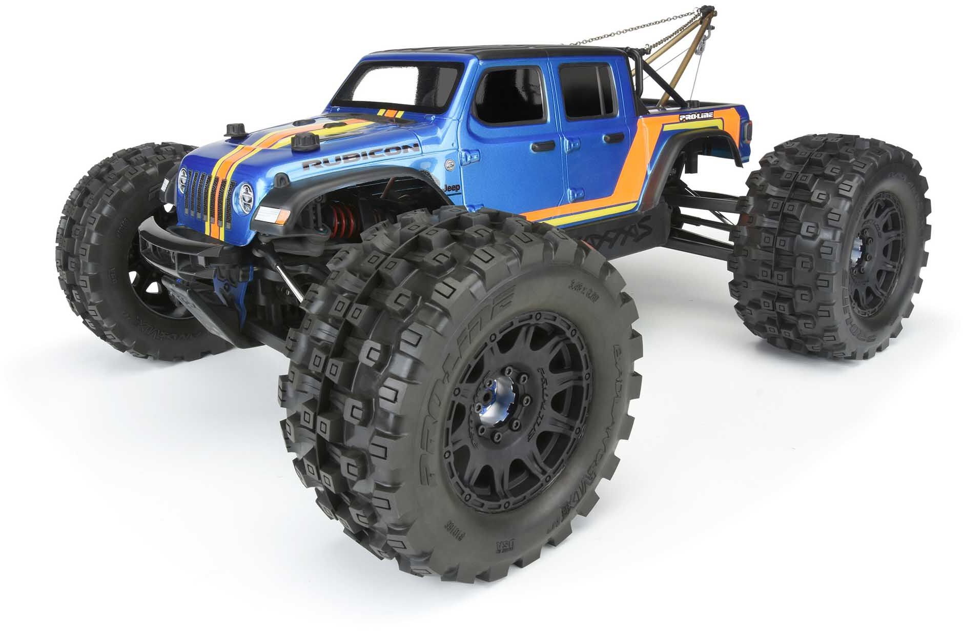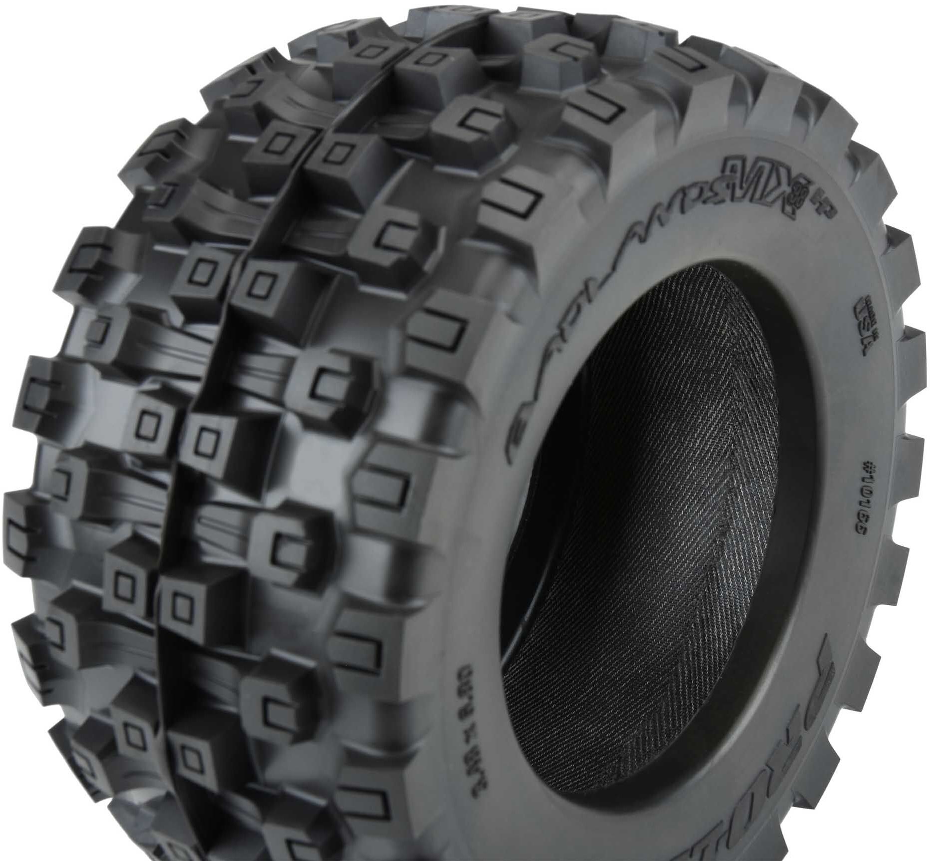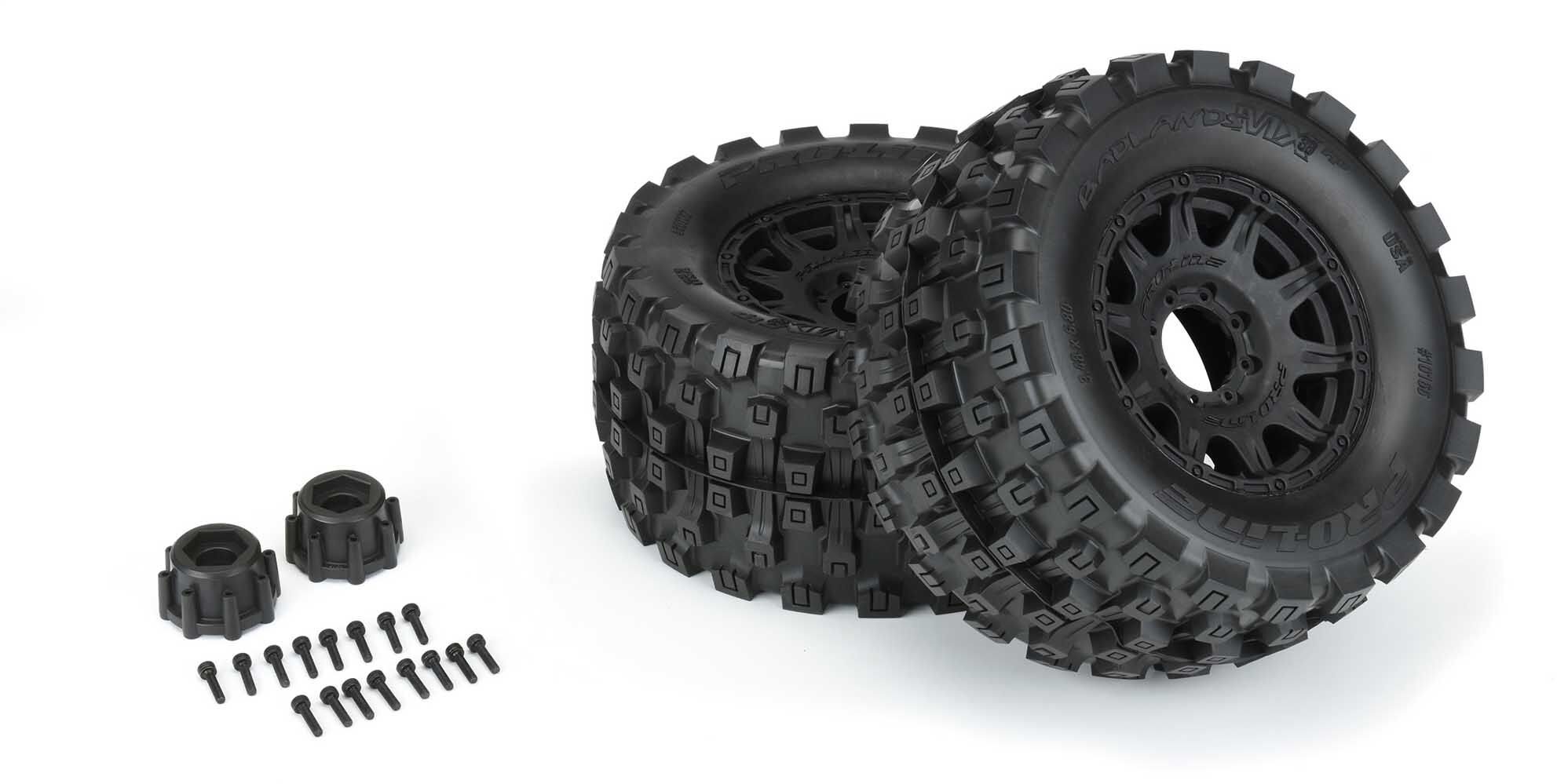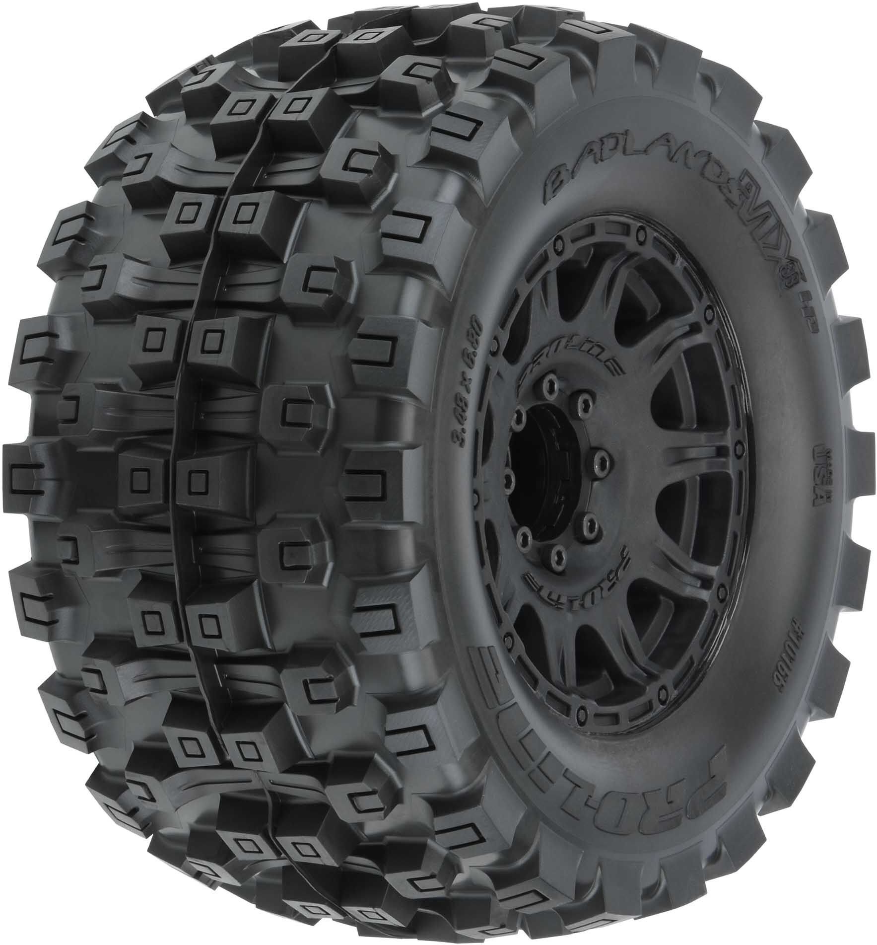 This is a pair of pre-mounted Badlands MX38 HP 3.8" Belted Monster Truck Tires. Pro-Line Badlands tires are understood for having a sweet Motocross inspired tread and the Badlands MX38 HP tires kick that up a notch with Larger and Bolder knobby tread. The Badlands MX38 is a true All-Terrain tire that will find traction on any surface however is finest matched for loose & fertile dirt, mud or lawn. Simply envision your truck tossing up big rooster tails with these incredible looking tires!Pro-Line has developed the technology to mold a High-Performance herringbone weave pattern Belt within the Badlands MX38 HP tires that will prevent the tire from ballooning or broadening during use. This will give you optimal control to put the power down even at high speeds! The Badlands MX38 HP 3.8" tires offer the amazing grip that you expect from Pro-Line due to the soft M2 compound and the aggressive Motocross inspired tread. Pro-Line likewise heard the calls for a tire size to fit the existing generation of Monster Trucks and the MX38 HP provides at 3.48" large and 6.8" tall. Much like all of Pro-Line's tires, they are proudly Made in the USA!Tire Features:Molded-in High-Performance Herringbone Weave Pattern BeltAggressive Motocross Motivated Tread DesignBadlands MX38 HP 3.8" tires Will Not Balloon or Expand During UseSoft M2 Substance Offers Amazing Grip on a Range of SurfacesBelted Tires Offer You Control to Put the Power DownTire Size can be found in at 3.48" large and 6.8" tallSoft Foam Inserts Consisted OfMade in the USA, given that 1982 - Read about Pro-Line Racing's HistoryWheel Features:Detachable Hexes Enable you to Quickly Replace Damaged Hexes17mm Wide Balanced Out 8x32 Hexes are IncludedWheel Made from High-strength, Durable DuPont Nylon MaterialRaid 10-spoke Wheel Design Mimics Full-size Racing WheelsM3 Wheel Hex Hardware Consisted Of
