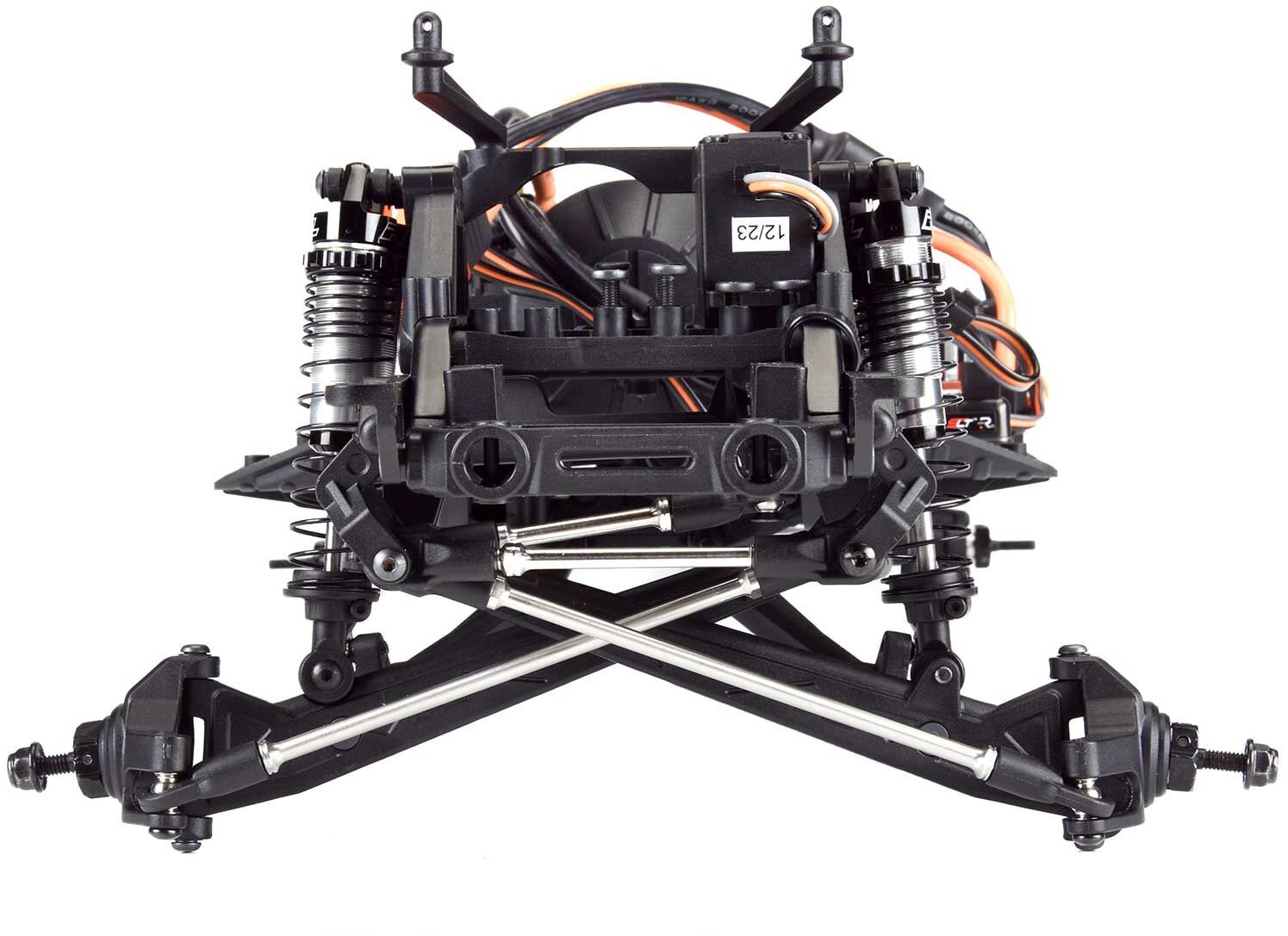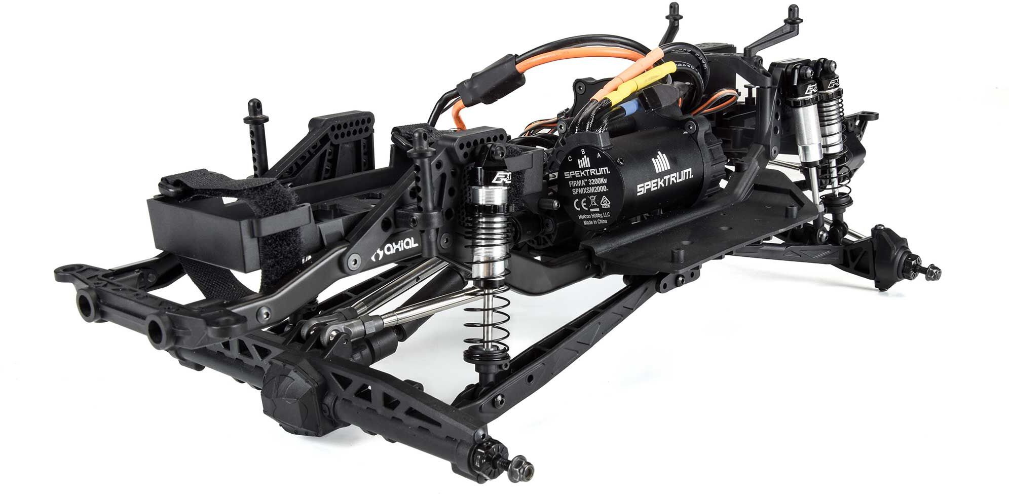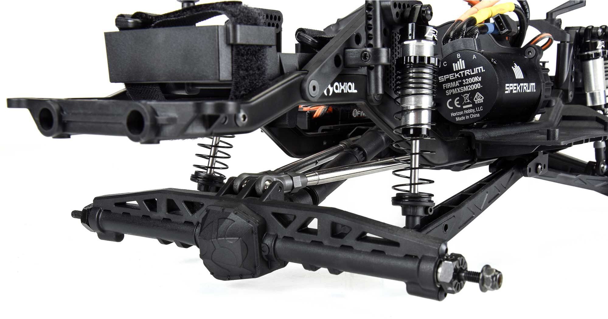At the front, extended “I-beam” arms cross in an authentic X-pattern to control lateral movement, while radius arms tie back to the skid plate for rock-solid fore-aft stability. The setup even includes true swing set steering and a center-mounted radius arm, giving your SCX10™ III the realistic handling and suspension travel of a full-size desert truck.