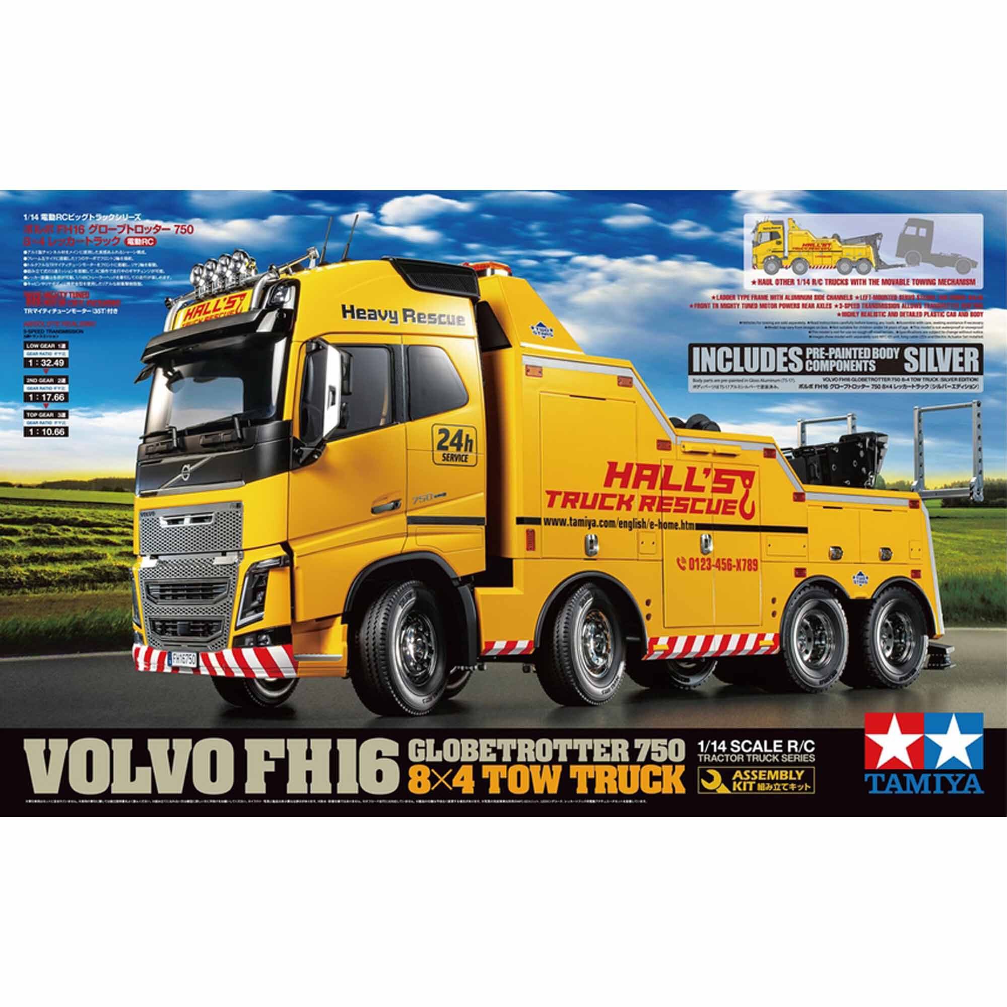 Volvo is a renowned actor in the global commercial vehicle market, with one of their flagship brands being the FH Series that underwent a full model change in 2012. This R/C model assembly kit recreates the 750hp engine FH16 Globetrotter 750 8x4 tow truck from that range. The model has a realistic cab and body, the former featuring a photo-etched front grille and interior details, the latter opening doors. The trucks fascinating towing mechanism uses metal parts and winch boom, under lift and outriggers are movable manually. The front mounted TR Mighty Tuned motor (35T) provides ample power to the two rear axles, via a three-speed transmission. Gear changes are also possible via transmitter controls, and the model can tow subjects such as 1/14 scale R/C tractor trucks.