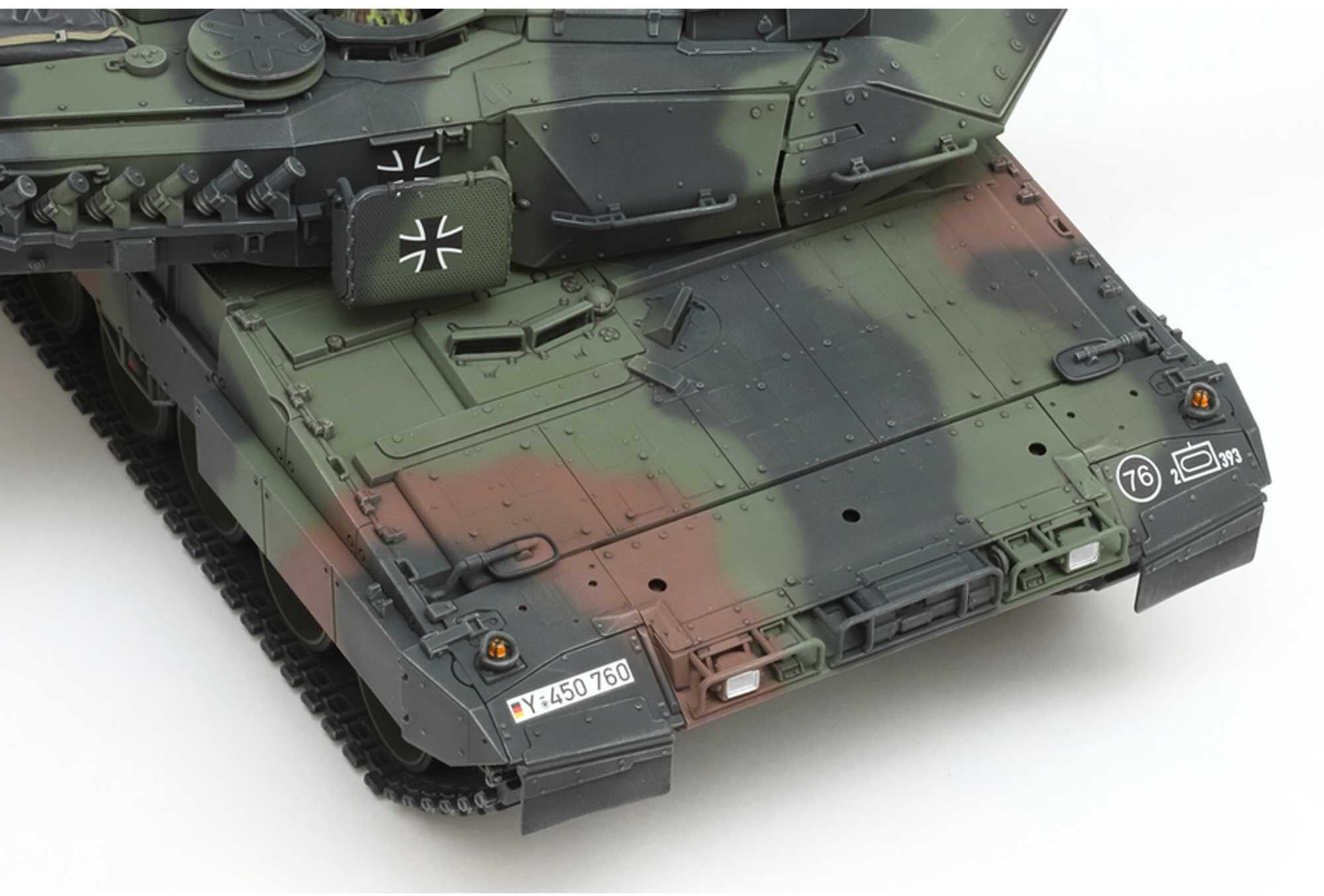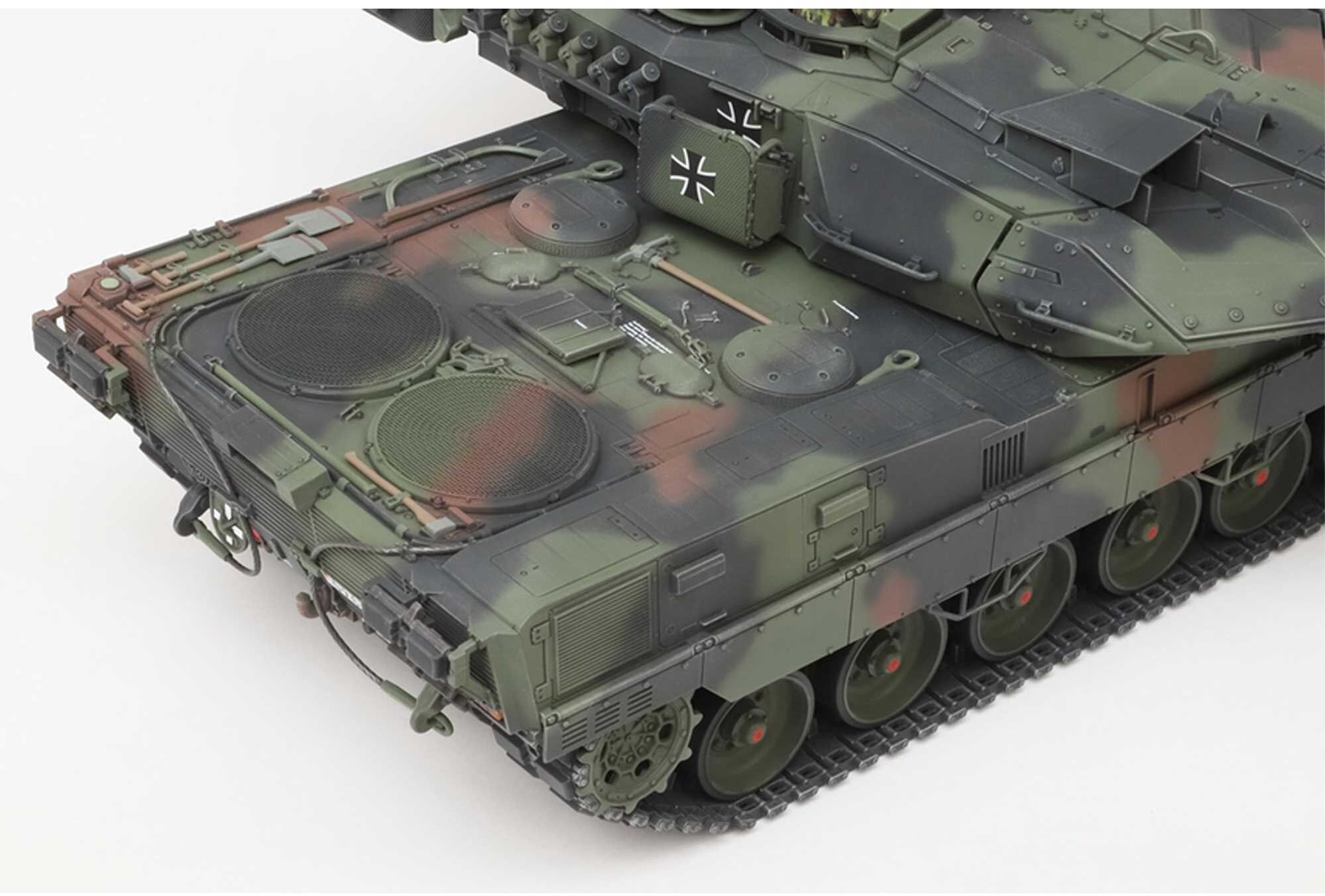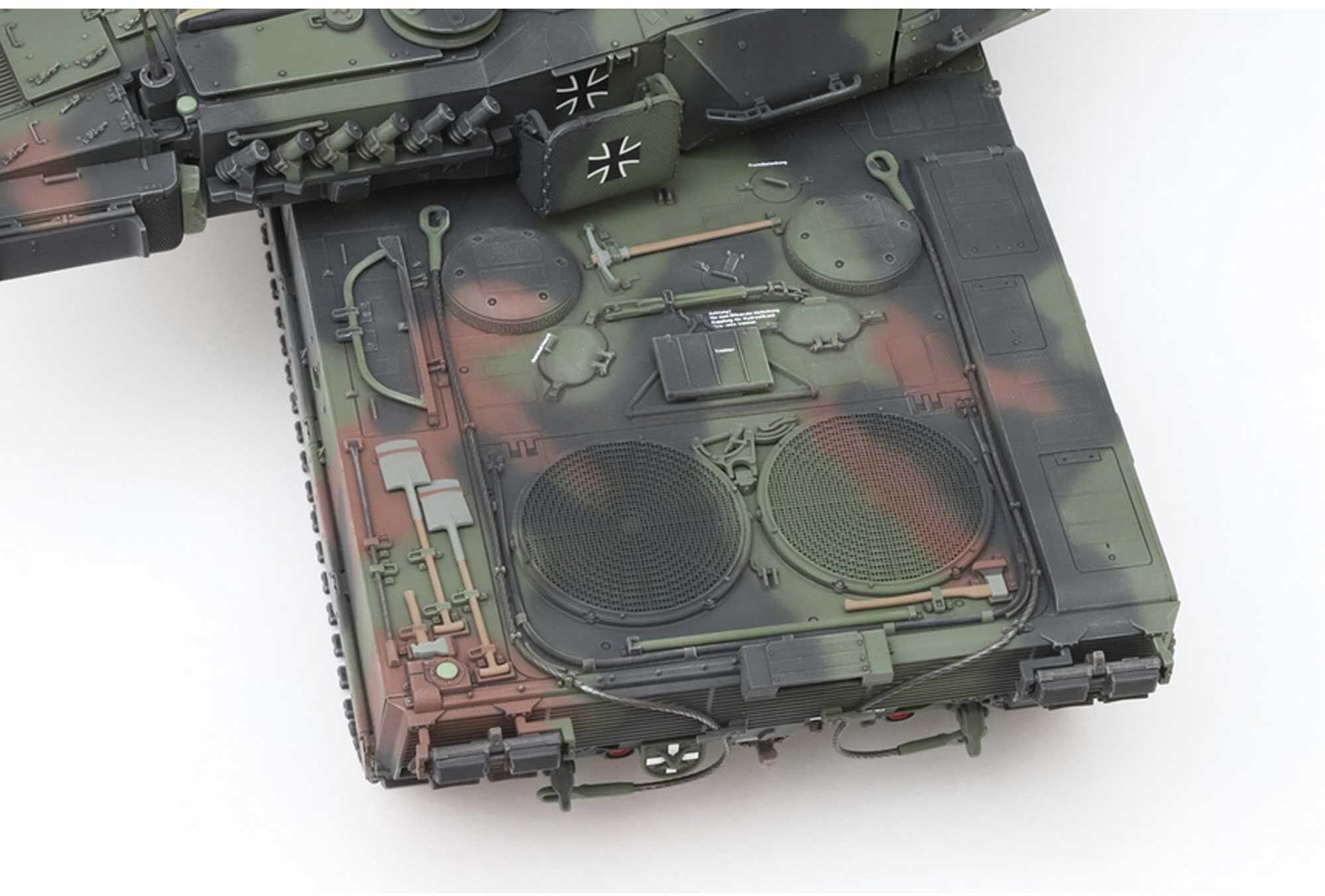 Compared to the Leopard 2 A6 model kit, which was released in 2004, this kit uses completely new parts and tooling. The Leopard 2 A7V is an improved version of A7 (A7 is improved version of A6 and the “V” in the A7V designation stands for “verbessert” (improved) ) and features additional hull front armor and side skirts for improved defense. The suspension was also improved to help deal with the tank's extra weight. The A7V inherits the A6's L/55 120mm gun, but with the updated shell, the A7V can take on enemy armor up to five kilometers away. Units began receiving the A7V in September 2021 and A7Vs saw further improvements such as turret-top stowage boxes and main sight visor.